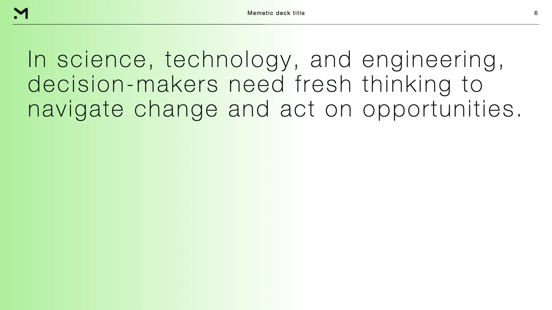 A rebrand for Memetic, a specialist science and deep tech communications agency. The new logo is dynamic and modular - with the shape of the M becoming a diverse design component as pattern, image frame, outline and works as a window into the memetic universe.